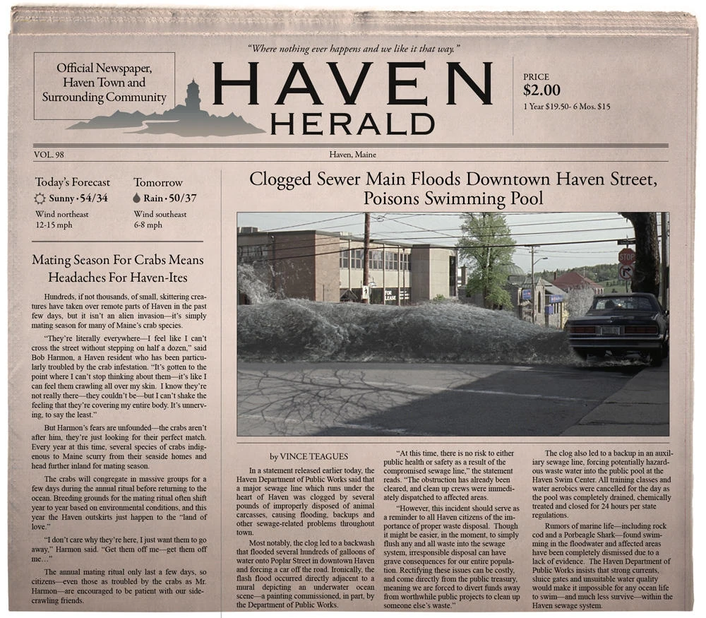 The Haven Herald ran two stories about the effects of Daphne Harris' Trouble. The main article is on the flood on Poplar Street. The Haven Department of Public Works released a statement saying that the flood was caused by a clogged sewer line. This clogged sewer line is also used to explain the blood in the water at the Haven Swim Center; it's referred to as "potentially hazardous waste water". The article calls report of marine life in the flood water "rumors" and dismisses these reports out of hand. The second article discusses crab mating season and explains the thousands of crabs in downtown Haven as a normal occurrence in the mating cycle. The article contains quotes from Bob Harmon.