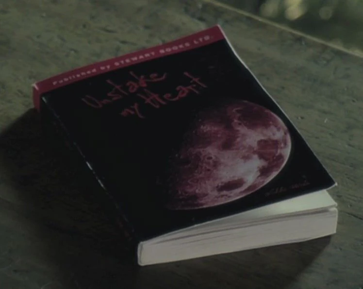 ↑Audrey's apartment is sparsely decorated, but there are books everywhere. Two of the books are shown close enough to read the titles, Unstake my Heart[allusion 2], and To the Tenth Generation.